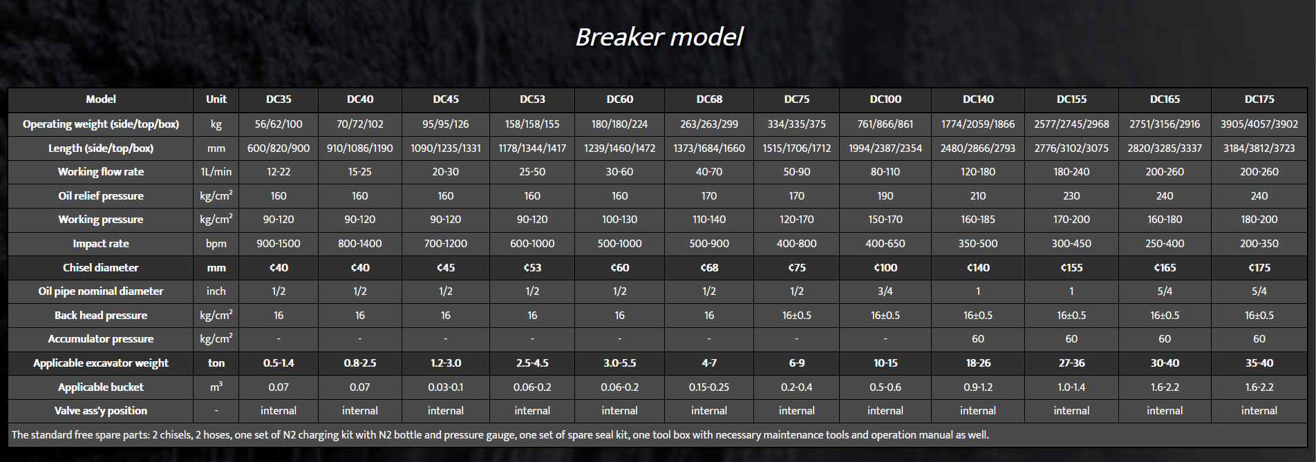 | Optimaalinen kaivurin paino | ton | 0.5-1.4 | 0.8-2.5 | 1.2-3.0 | 2.5-4.5 | 3.0-5.5 | 4-7 | 6-9 | 10-15 | 18-26 | 27-36 | 30-40 | 35-40 |